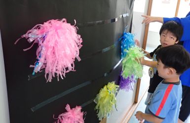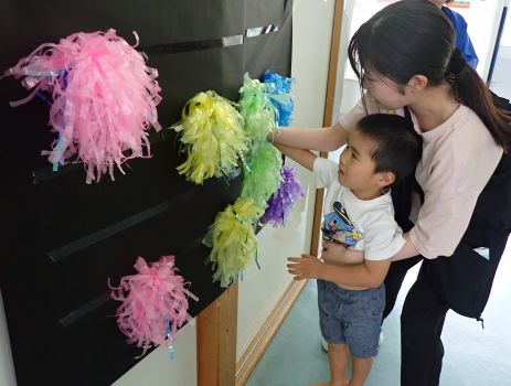 大きな黒の模造紙は夜空、タフロンは花火に見立てておたんじょう日のお友だちに貼ってもらいました。
