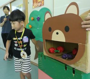 おたんじょうびのお友だちには果物を収穫してもらい、クマさんに「どうぞ!」と採れたての果物をあげると…
