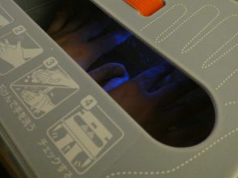 手洗いで落としきれなかった部分がブラックライトの光で光ります。