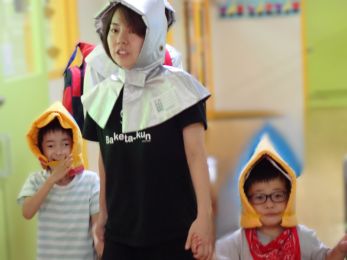 次に館内放送を聞いて、防災頭巾を被り避難の練習をしました。