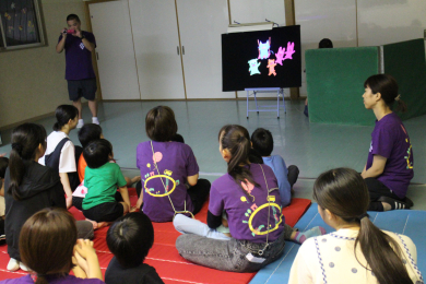 ご飯の後は夜のお楽しみで花火をする予定でしたが、雨が降ってきたので、大きなお部屋での光のシアターとなりました。