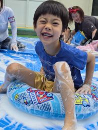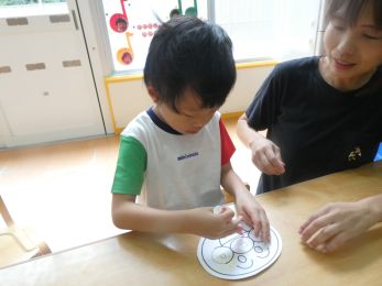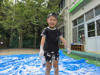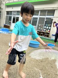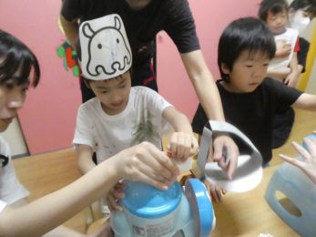 朝のお楽しみはかき氷づくり、お面のお絵描きとお庭での泡あそびでした.