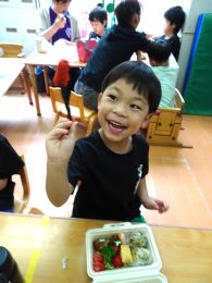 朝は愛育園に集合し、みんなでお弁当を食べました。