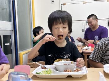 夕ご飯は「愛育園レストラン」に行きました。メニューはカレーライスや唐揚げ、鮭のつけ焼きなど子どもたちの好きな物がいっぱいで、みんなもりもり食べていました。