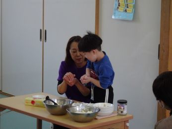 お父さんお母さんにも手伝ってもらいながら材料を入れたり、順番によーくかき混ぜましたよ。