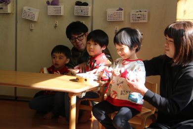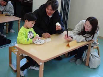 からだを動かした後はおもちつきごっこをしました。お父さんお母さんに見守られながら力いっぱいぺったんぺったんと「おもち」をつきました。