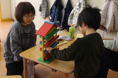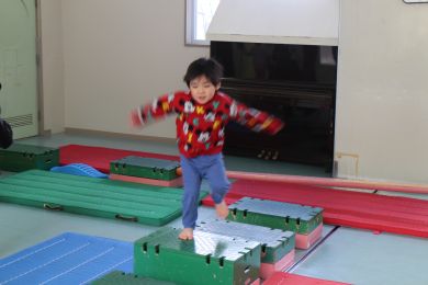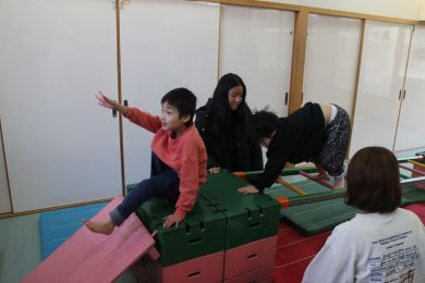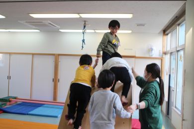 うんどうあそびでは、はしごやウエーブバランス、とげとげの半円ボールの飛び石など、お父さんやお母さんも一緒に楽しみましたよ。