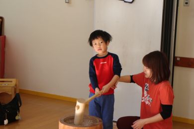 小麦粉粘土の「おもち」を順番につきました。グループの活動でも何度か経験していたので