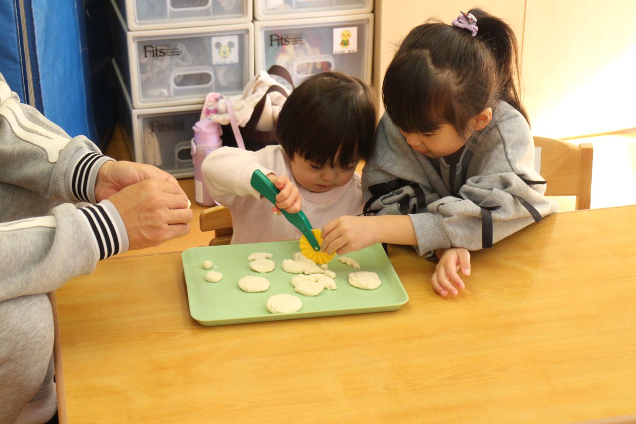 ペッたんこー!ぺったんこー!と、慣れた様子でついてから、みんなで分けて粘土あそびをしました。