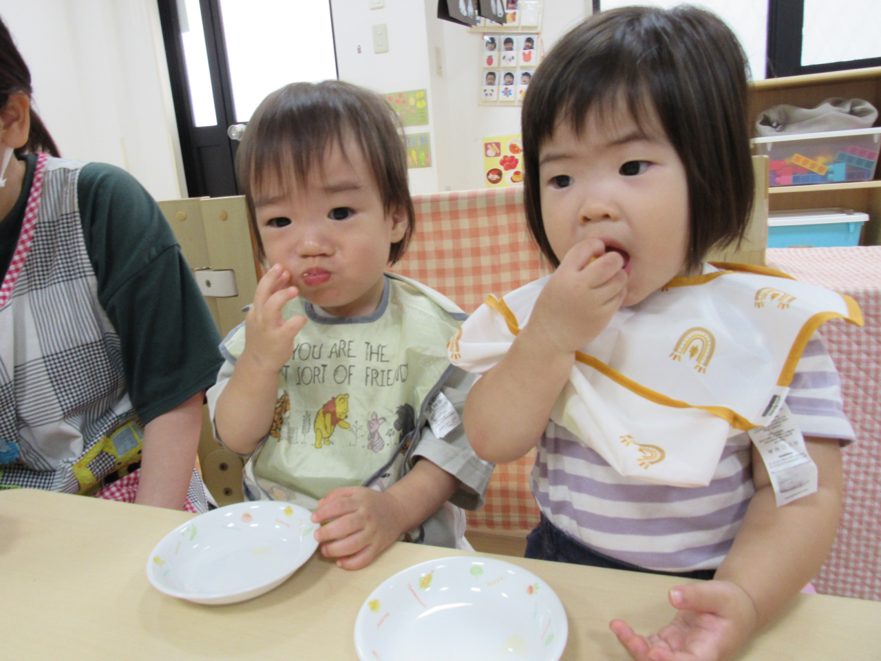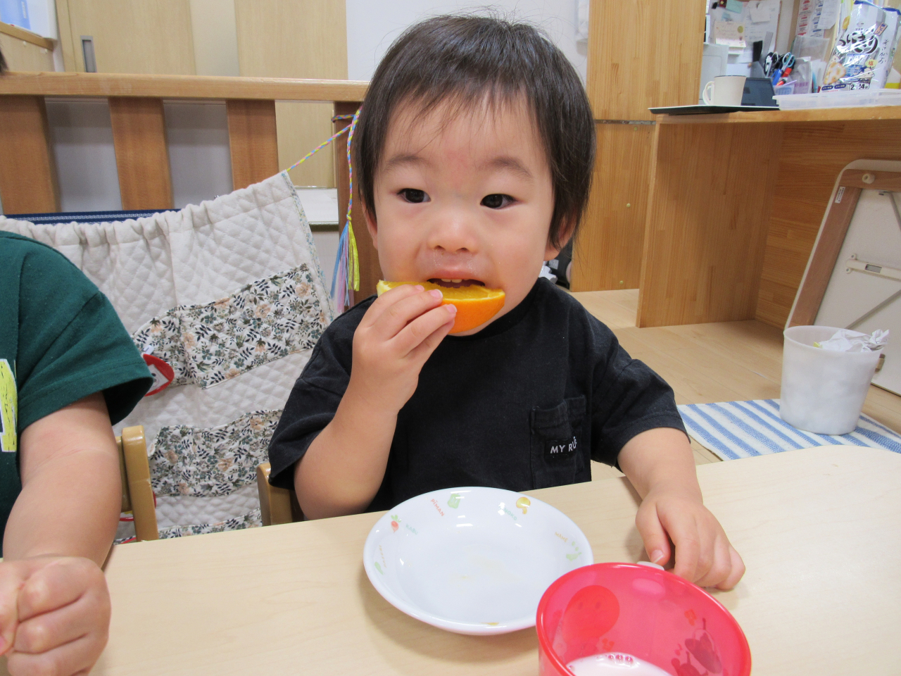 1口食べると「スッパイナ!」と言いながらも嬉しそうに食べてオレンジの甘酸っぱさを味わっている子どもたちでした♪これからもたくさんの食材に触れていきたいです!!