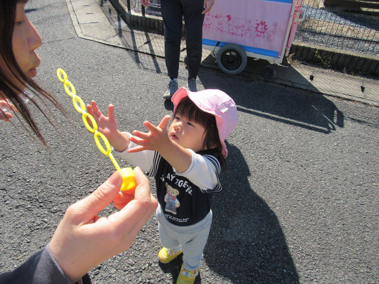 お散歩に行った先で今一番みんなが楽しんでいることは、しゃぼんだま遊びです♪