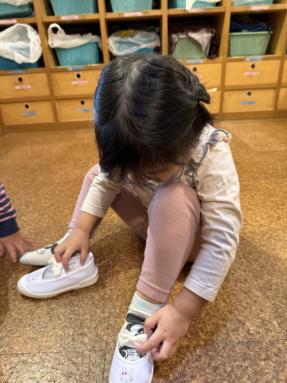 桂保育園に来る時の持ち物が一つ増えましたよ!それは「上靴」です。上靴をはくことをとっても楽しみにしていたさかなグループのお友だち。桂保育園に来ると「ウワグツ モッテキテン!」「ジブンデ ハケルデ!!」とたくさんお話してくれていましたよ!張り切ってはいている姿に、お家の人と一緒に練習してくれたんだなと感じました。