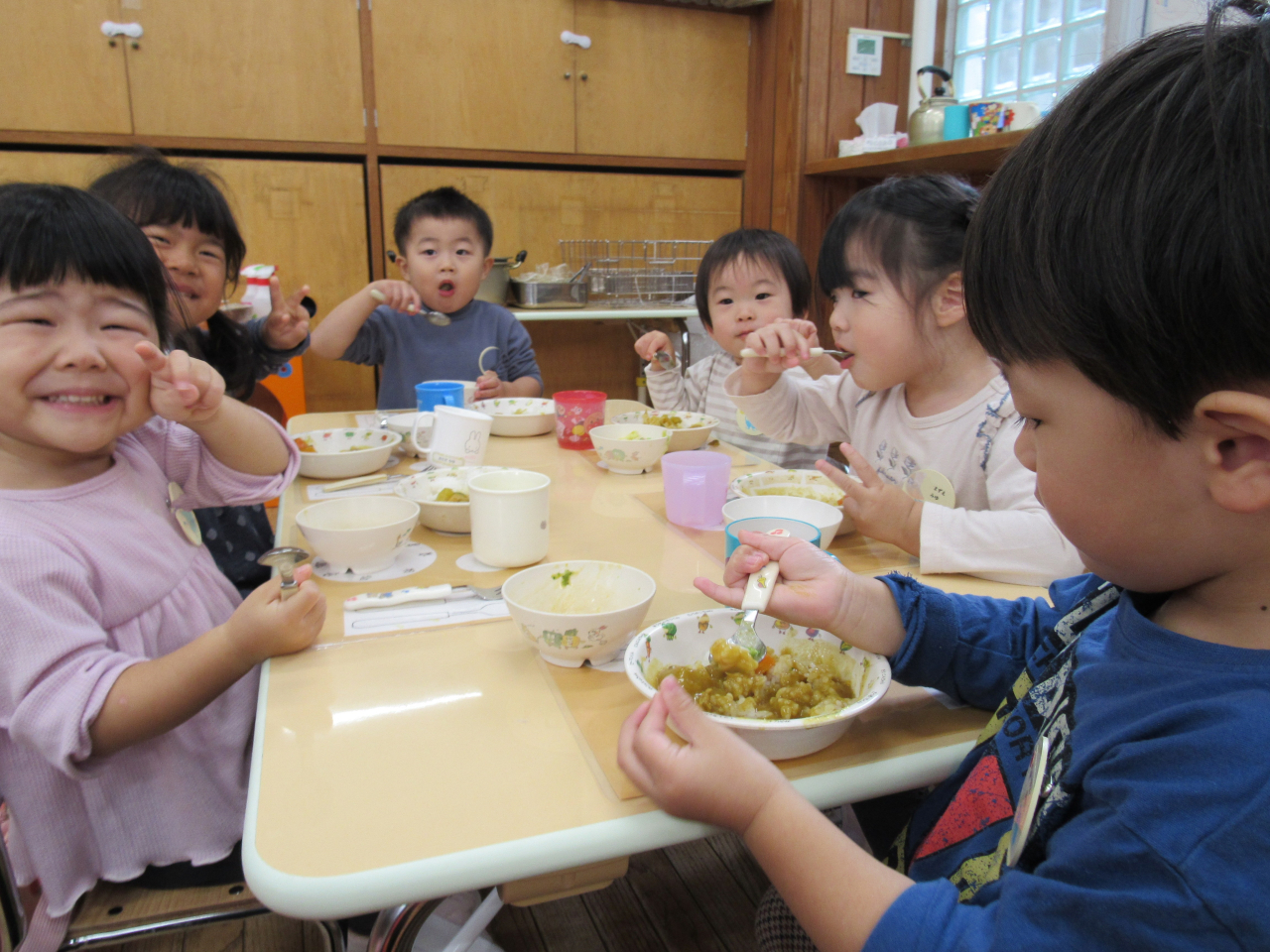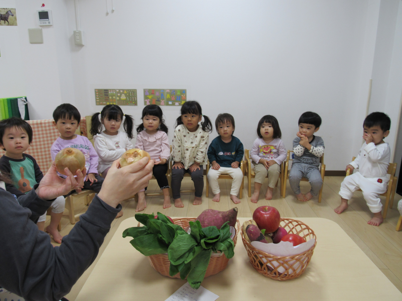 礼拝では1つづつ持ってきてくれたお野菜を紹介しました。自分の持ってきたものが紹介されると「アッ!!」「〇〇チャンノ リンゴ!」などと教えてくれましたよ。