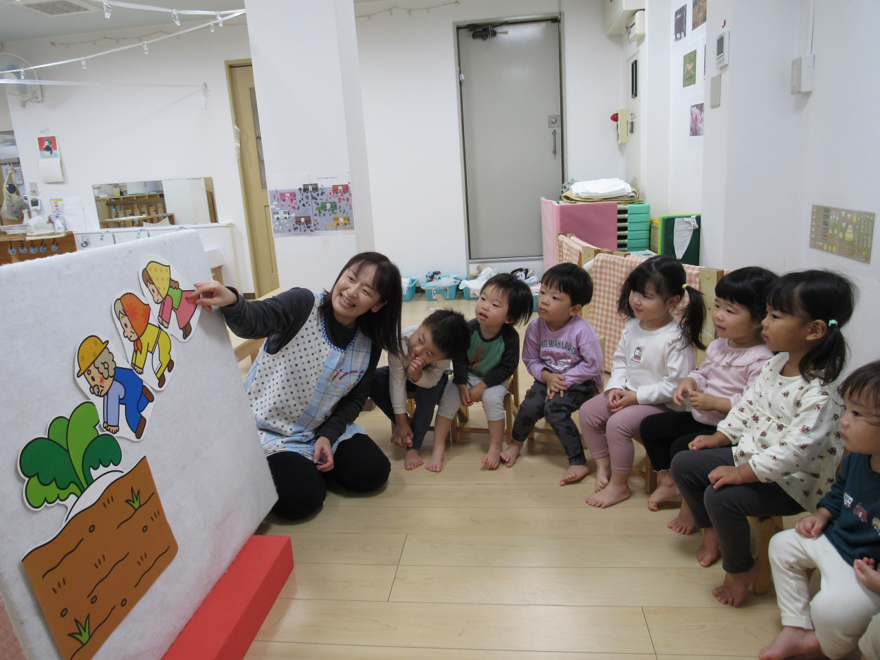 その後はみんなで大きなカブのパネルシアターを見ました。「ウントコショ ドッコイショ」とおじいさんを応援して楽しんでいる子どもたちでした♪