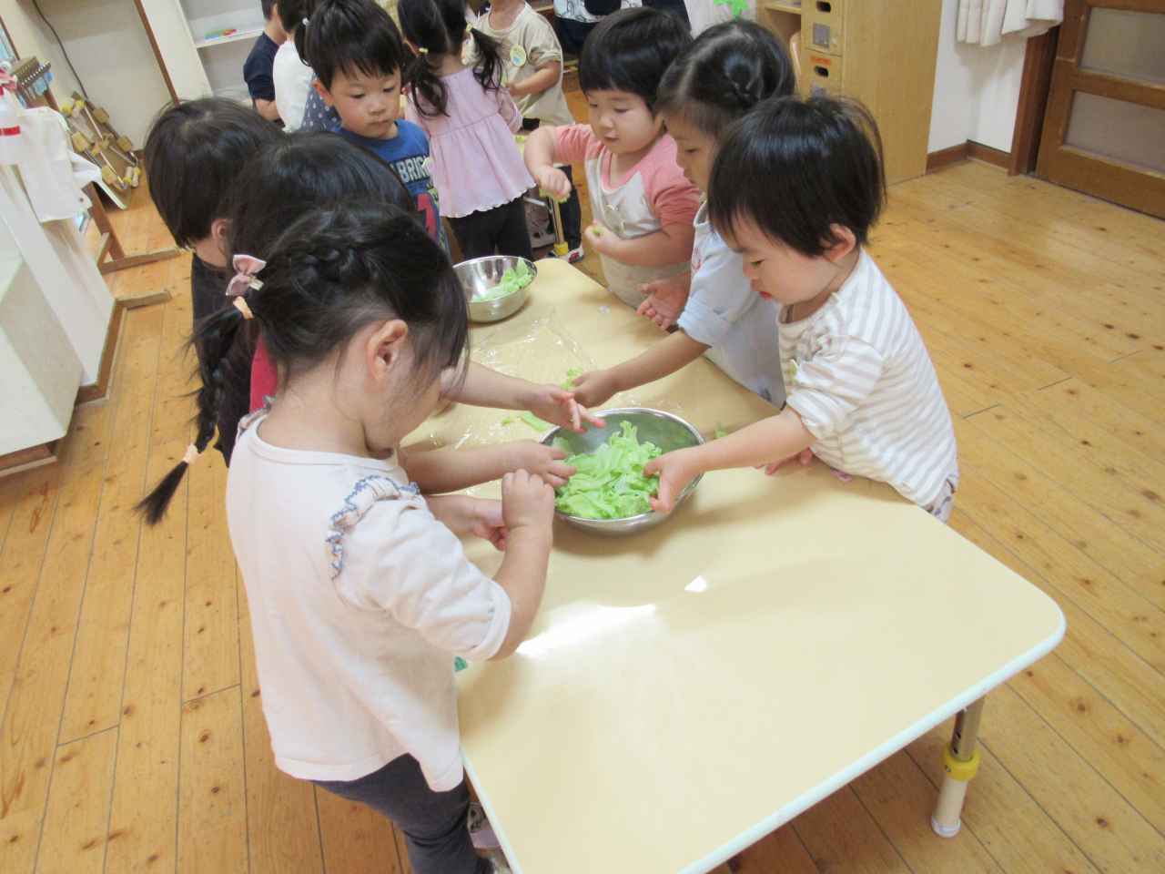 次の日、2歳児さかなグループのお友だちは桂保育園でクッキングをしました。桂保育園の2歳児のお友だちと一緒にレタスちぎりに挑戦!