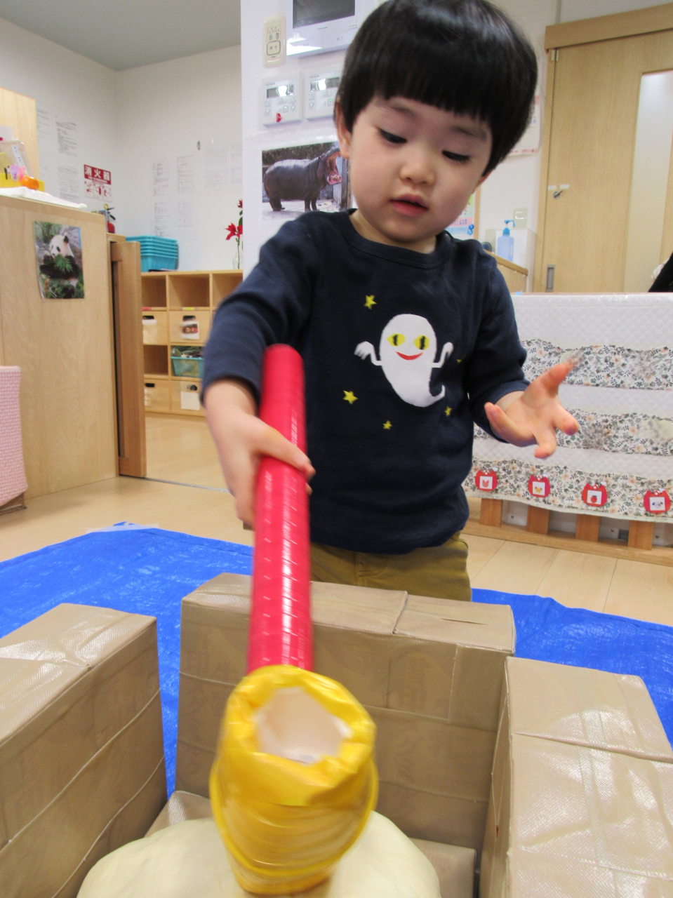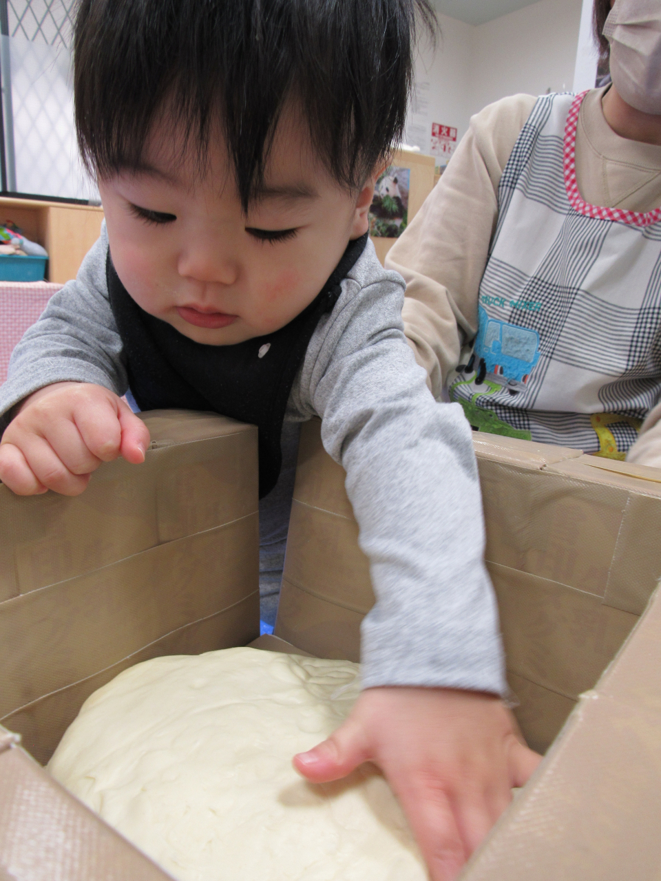 1歳児ことりグループ、0歳児どうぶつグループのお友だちはお部屋でおもちつきあそびをしました。