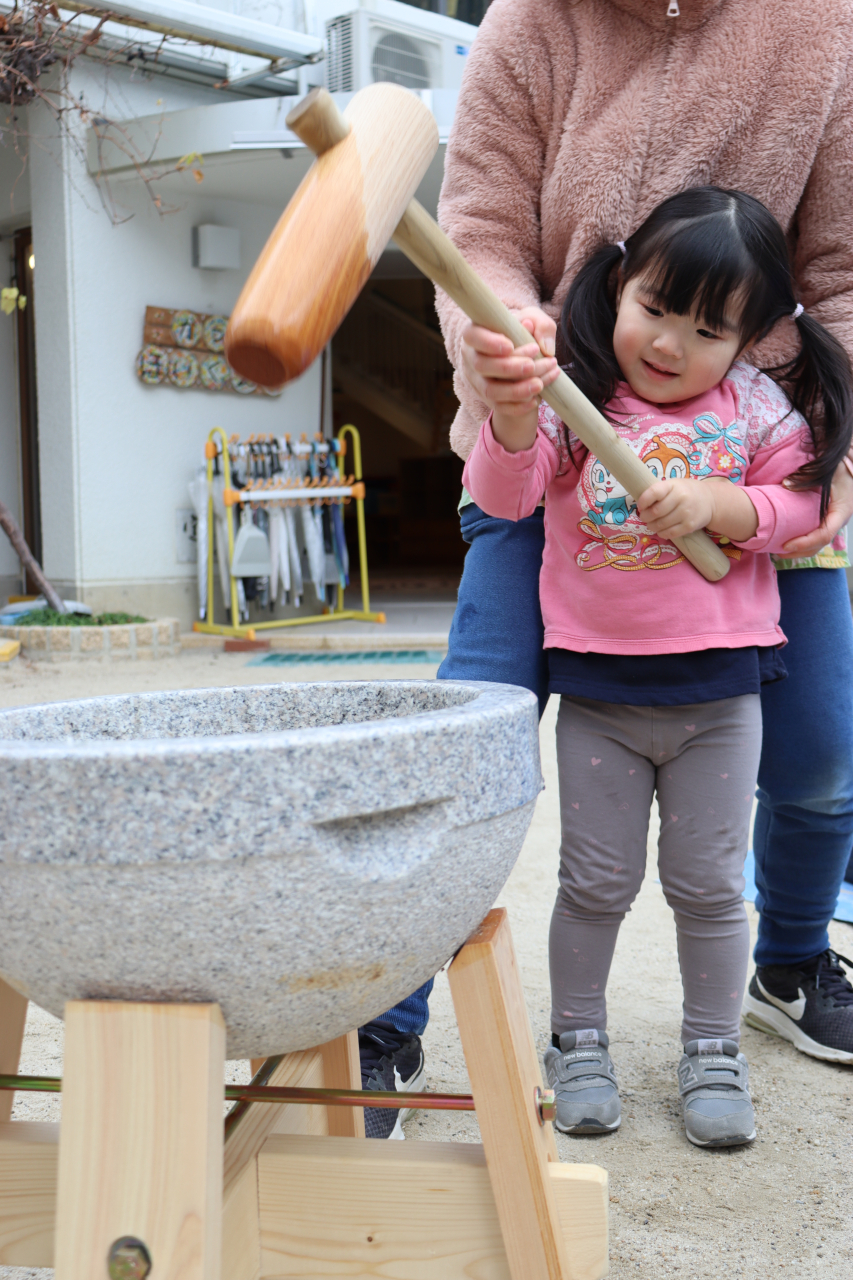 2歳児さかなグループのお友だちは、連携施設の桂保育園にて2歳児すみれぐみのお友だちと一緒におもちをつきました。
