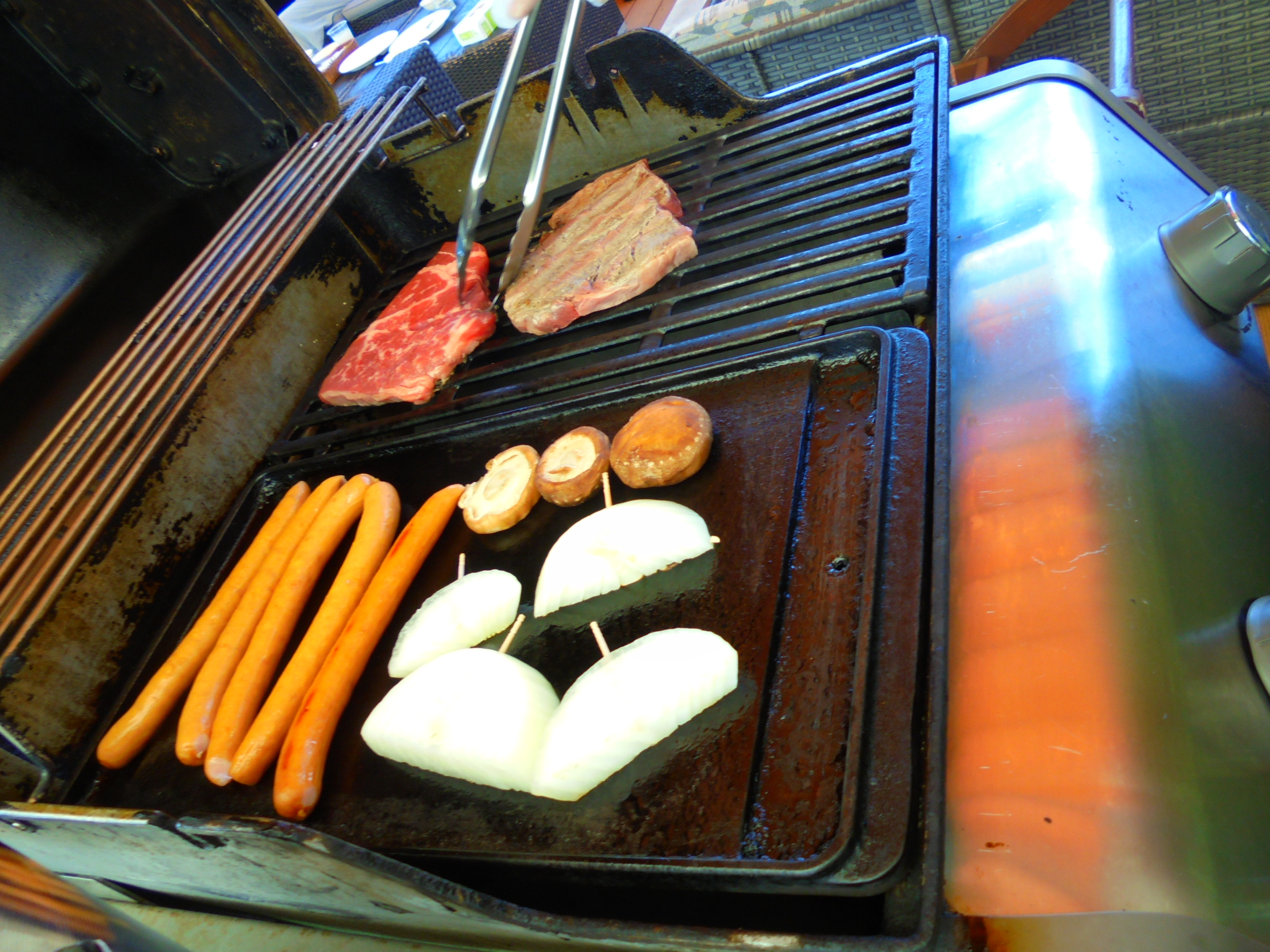 大きなお肉やソーセージ・野菜や焼きおにぎりと