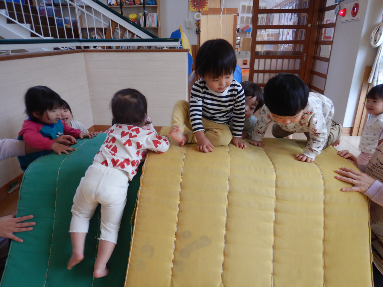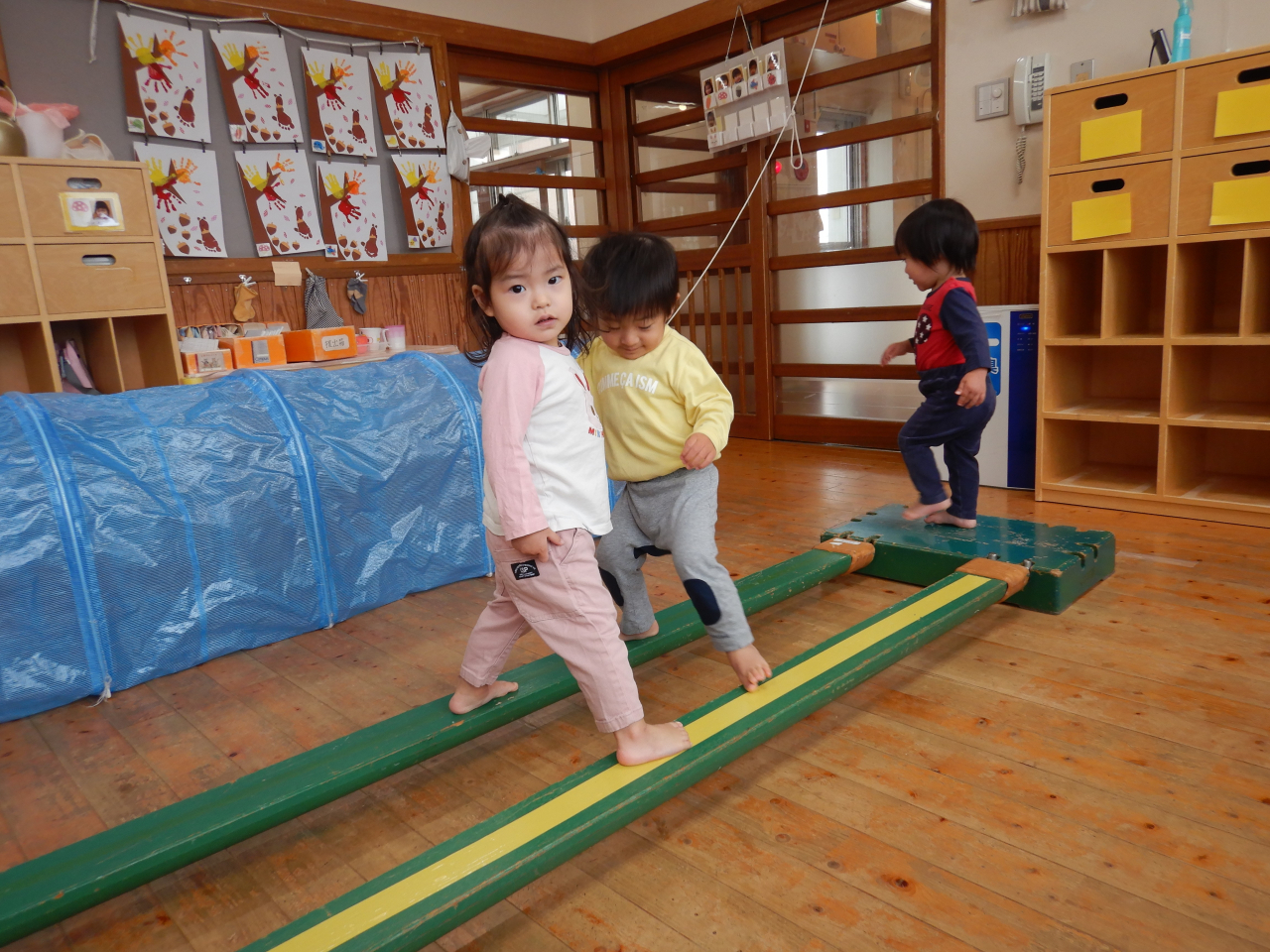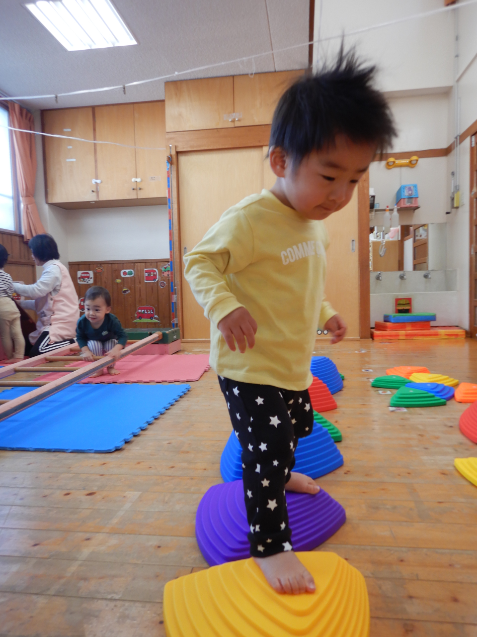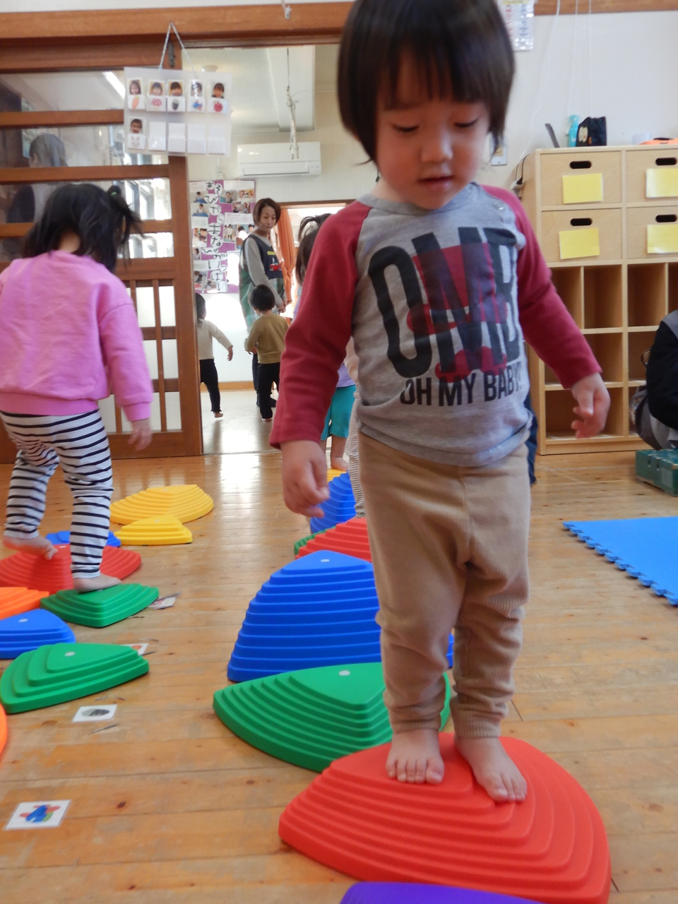 うんどう遊びでは、子どもたちは自分の体を思うように動かすことが出来てきてとっても嬉しい様子です♪自分で体を調節しながら、バランスストーンや平均台を落ちることなく渡ることも上手になってきました!