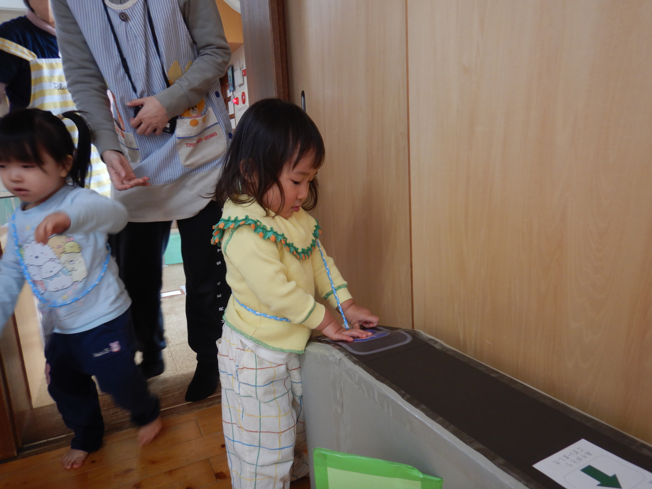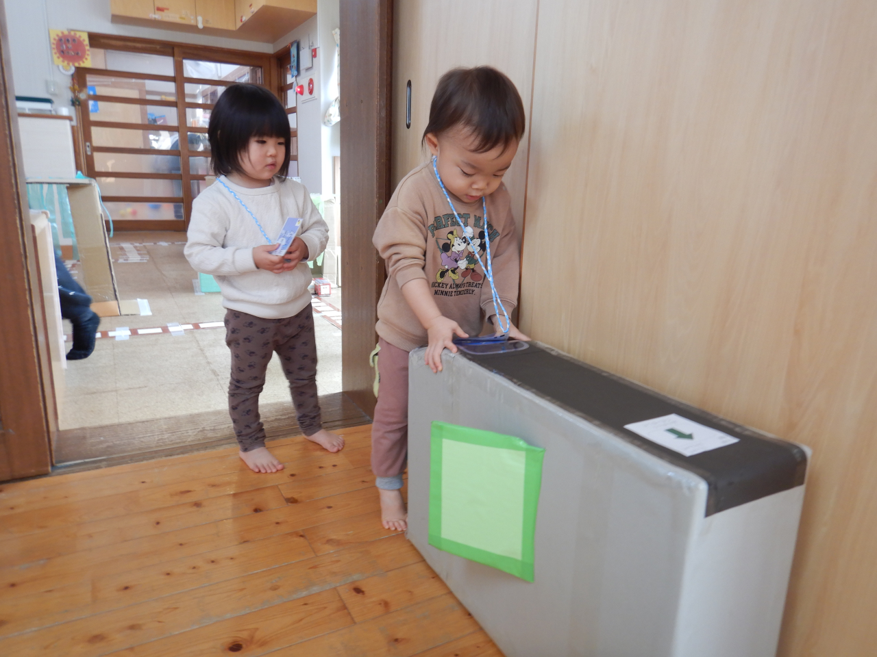前回はリアルな手作りの踏切の登場でしたが、今回はなんと手作りの改札口とカード!!ピッと音まで鳴ります!子どもたちの興味に合わせてさらに遊びの幅が広がるように保育士も全力でサポートします!