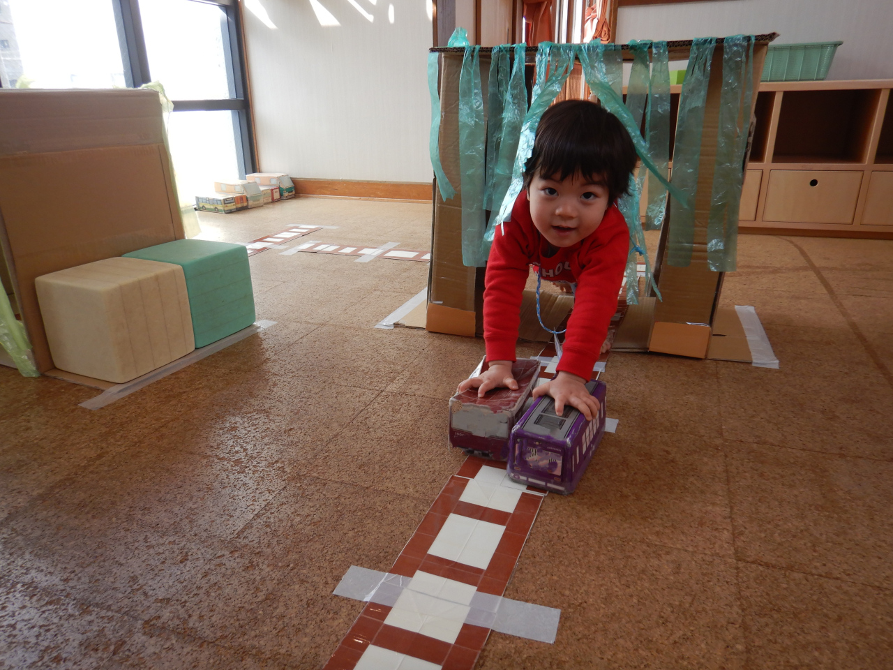 牛乳パックで作った電車を走らせながらトンネルをくぐったり…