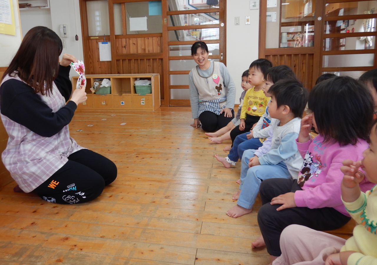 空フロアで一番大きな2歳児クラスのお友だちは、イースターの内容が書かれている神さまの絵本を読んだりみんなが模様を描いたイースターカードを見せながら伝えましたよ!
