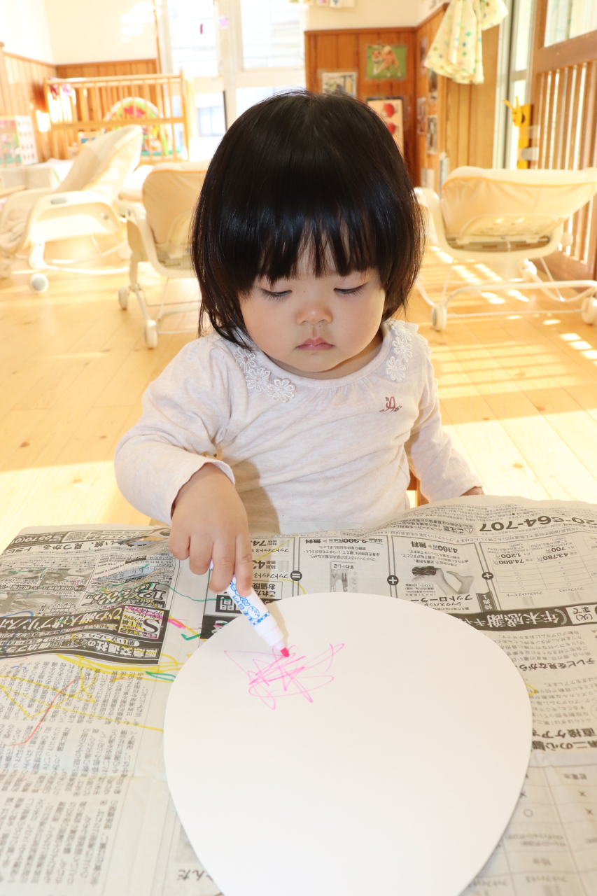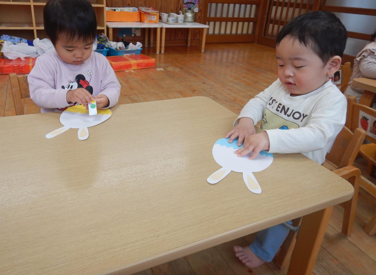 1歳児のお友だちは、大きな卵にシール貼りやなぐり描きをしました!