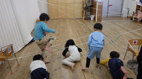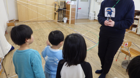 ゴムに当たらずにどこまで足を上げればまたげるのか、しゃがめば進めるのかなど自分の手や足はどこまで伸びるのか自分の身体を把握し、どんな風に身体を動かせばいいのかボディイメージを持つこと、動きたい体をゆっくり動かしたり止まったりするなど調整力をねらって、忍者になりきって楽しく取り組みました!