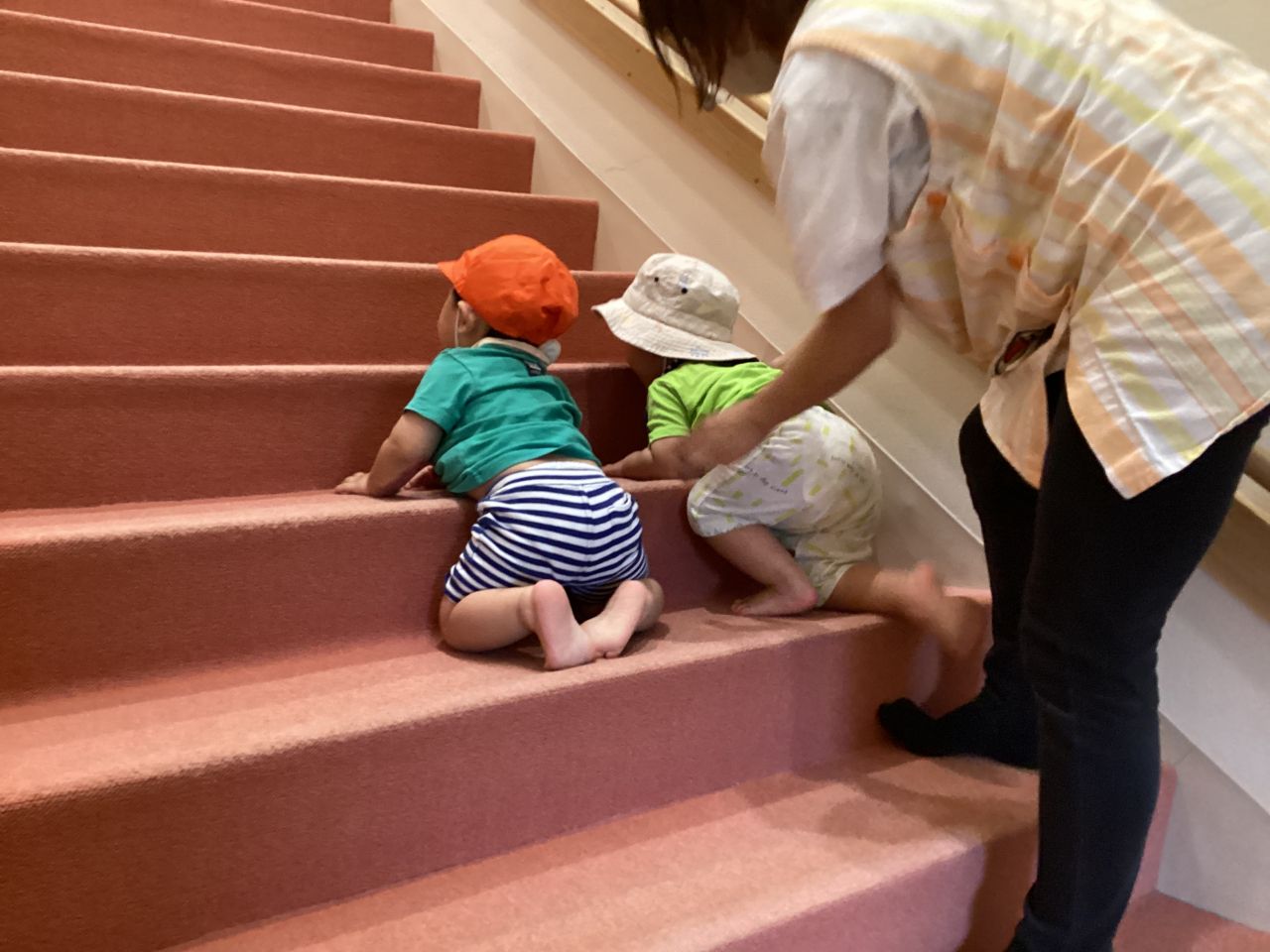 しろぐみの部屋から「おしりから」とゆっくり階段を下りて、園庭に向かいます。