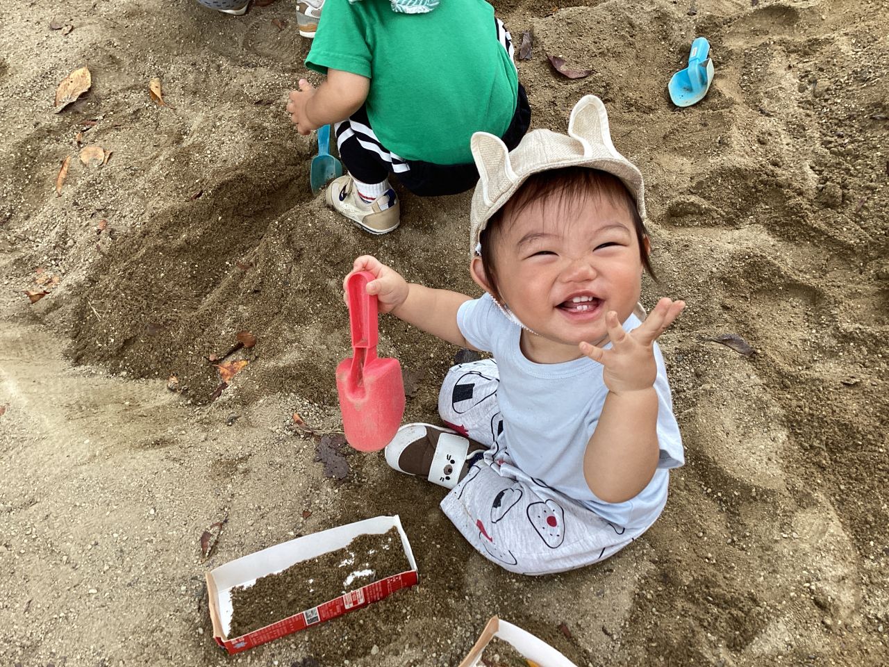 砂をギュッと握って感触を確かめたり、スコップを見つけて嬉しそうにすくってみる姿があったりと、久しぶり園庭あそびを楽しみました。