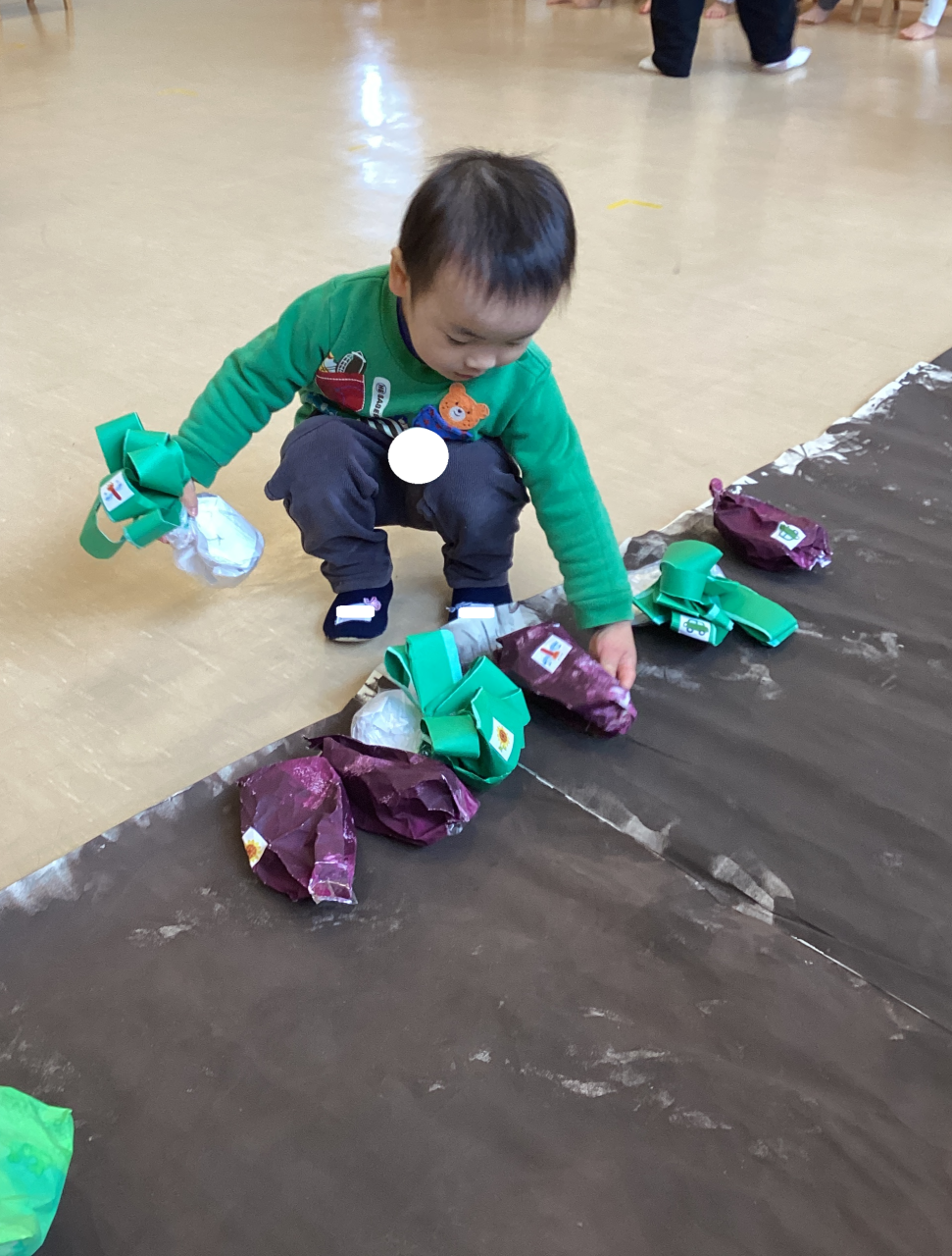 また、みどりぐみが製作で作ったお芋とカブを、コロッコしてくれた畑に置くと、「コレ、ツクッタヨ!」と嬉しそうに教えてくれる姿がみられました。