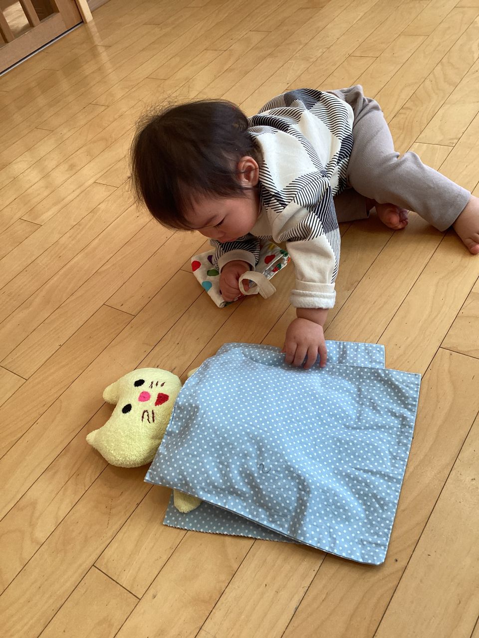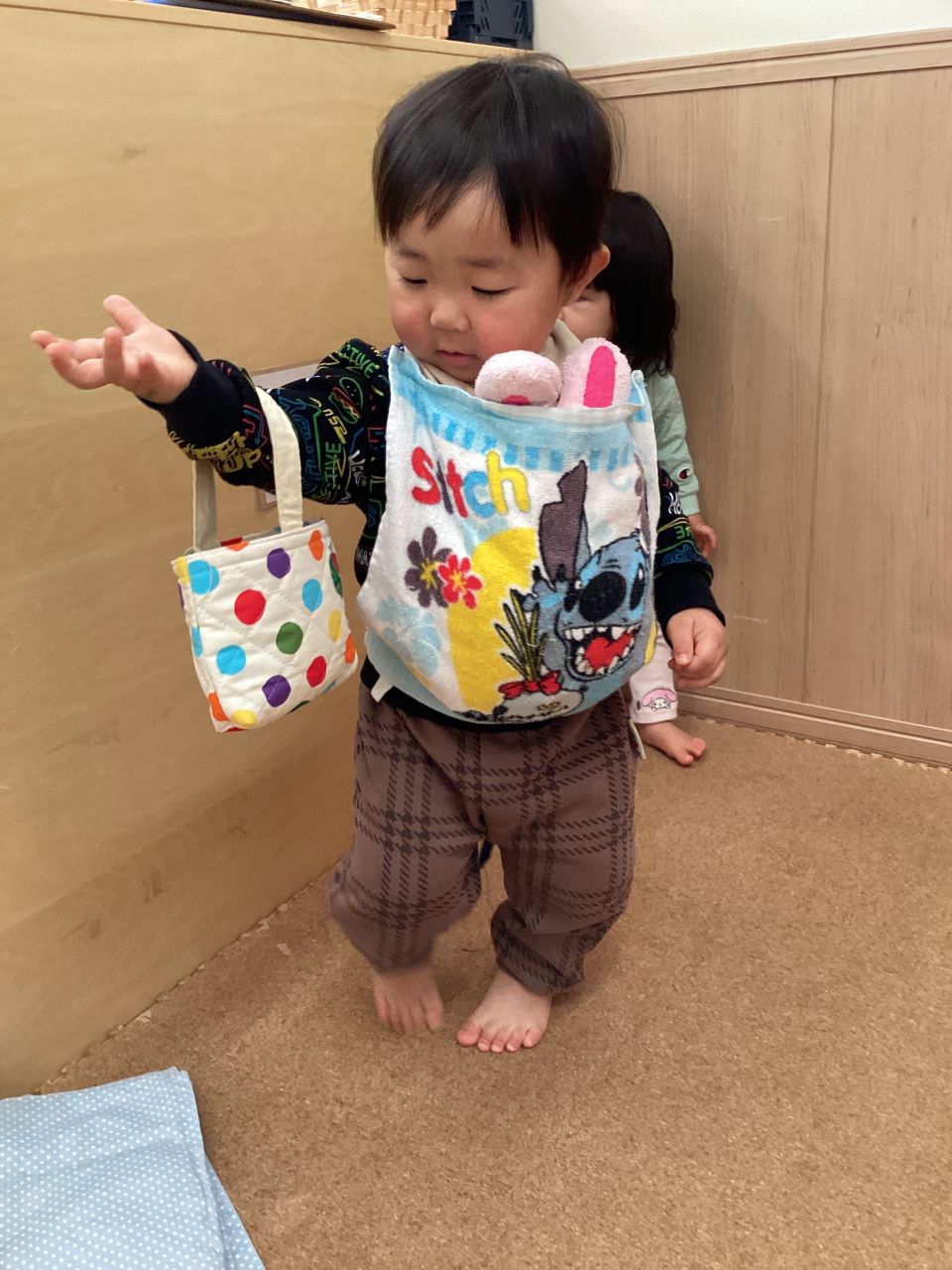 お人形を抱っこしたり、おにぎりやパンをたべさせてあげたりと、みんなでお世話あそびをたのしみました。