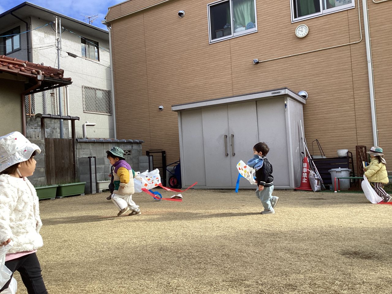 その後は、作ったたこをつきみ広場に持っていき、たこあげを楽しむももぐみさんです。