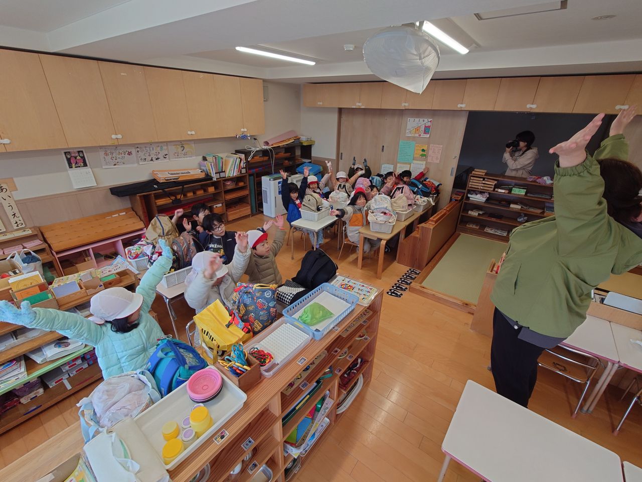 その後、夜空を見にテラスに出ているうちに、お部屋の中になんと魔女さんからのプレゼントが!!八瀬から見に来てくれていたことに皆びっくりで、大喜びでした。よく眠れる魔法をかけてもらい、ぐっすり眠れたきぐみ。2日目の朝を無事迎えられ、「お泊り 大成功~!!」と、皆でバンザイをして喜び合うことが出来て、大満足のお泊り保育でした。
