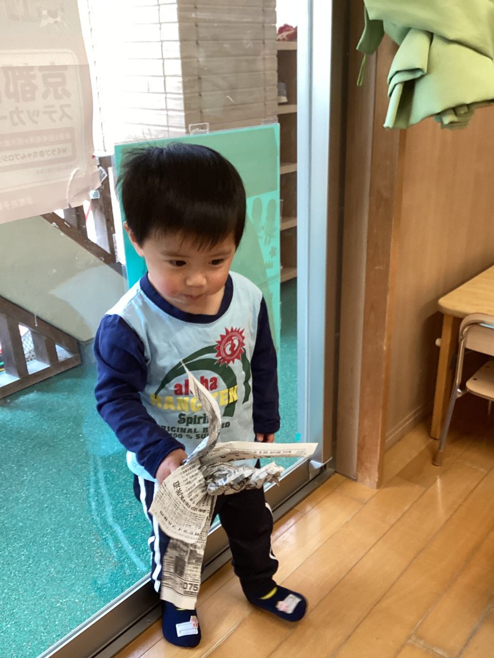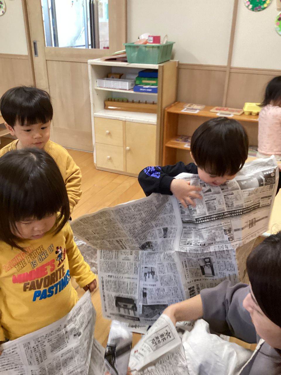 ももぐみのおともだちは新聞あそびをしてあそびました。