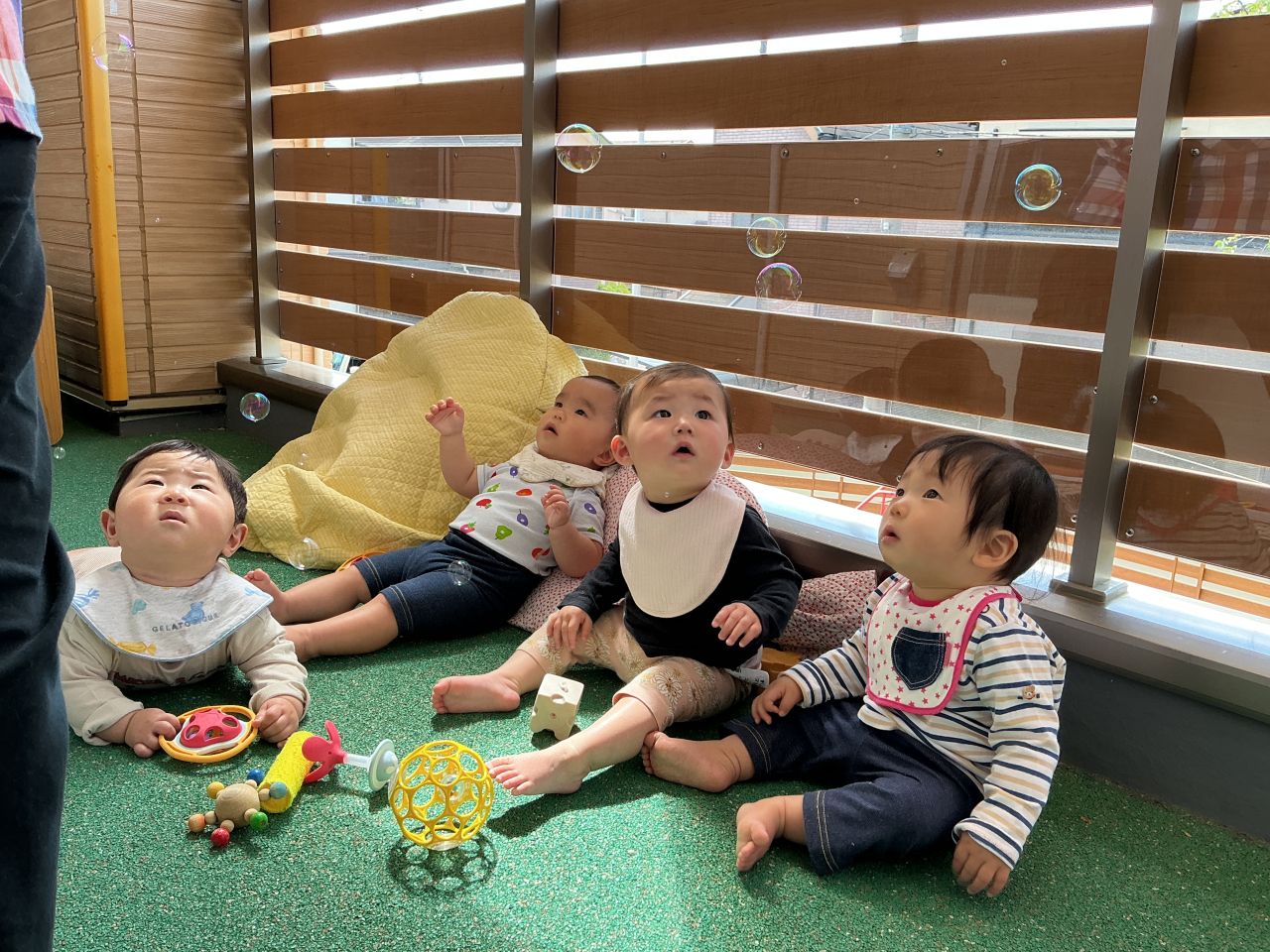風に乗ってふわふわ~と飛んでいくシャボン玉を触ろうと手を伸ばすしろぐみさん。