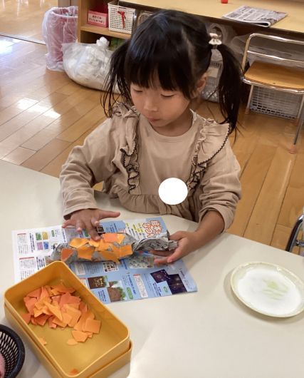 新聞紙で形を作り、画用紙を貼っていき、自分たちの好きな野菜や果物を