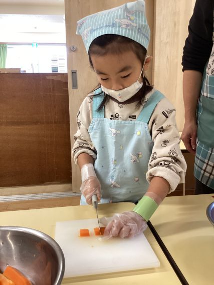 あお組さんは初めて包丁・バターナイフを使って人参を切っていきました。